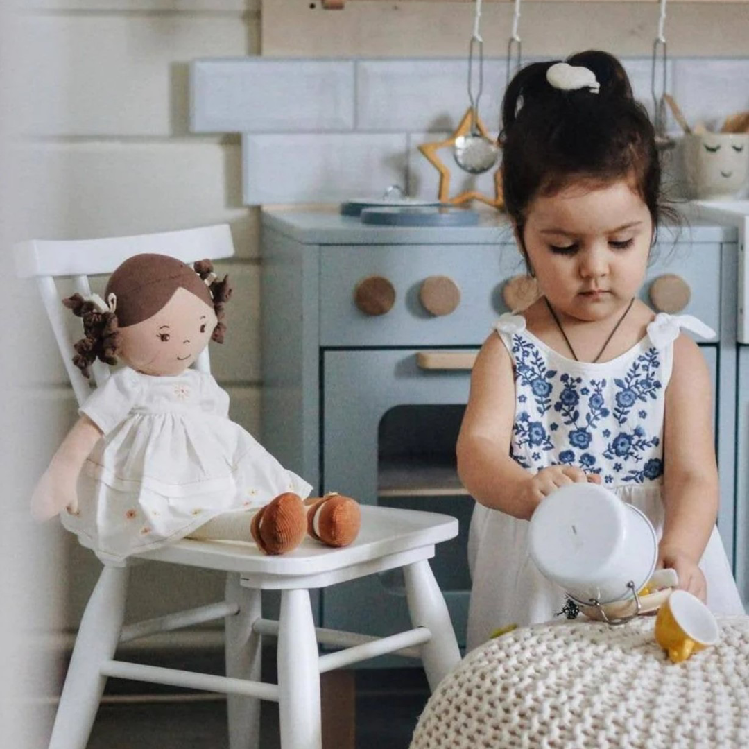 Meet Cecilia, she is a huggable soft doll. She comes wearing a beautiful cream all-natural linen dress with matching brown shoes, cream tights, and cream hair ribbons.