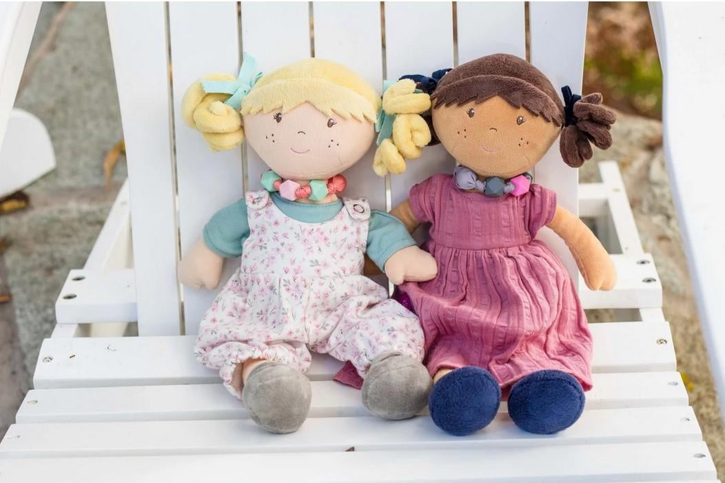 She is 38cm tall and is dressed in a pink flowery jumpsuit. Has blonde hair tied in cute pigtails.
