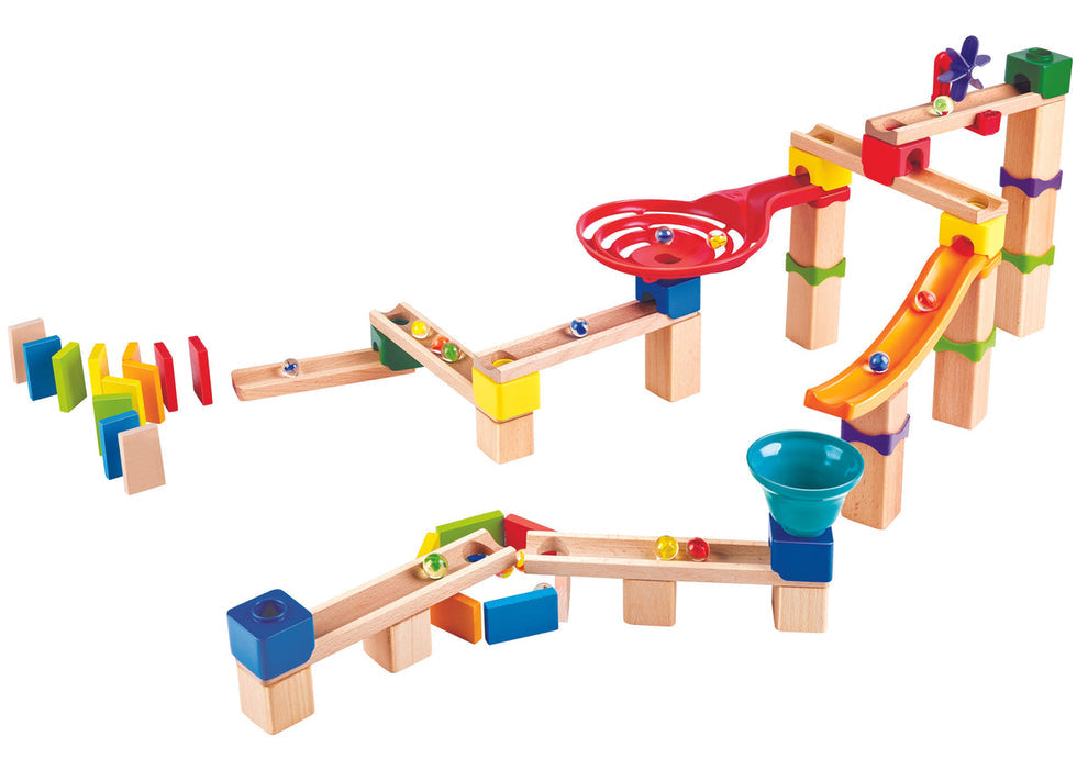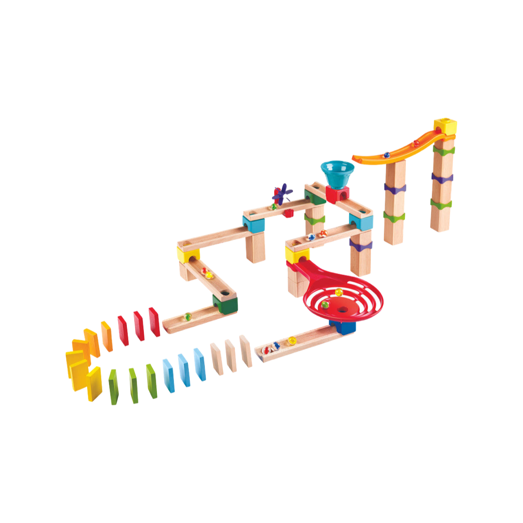 Build the towers and tracks and send your marbles rolling down through all the tricks, twists and surprises! Will it land in the bell-bucket or knock over the dominoes?