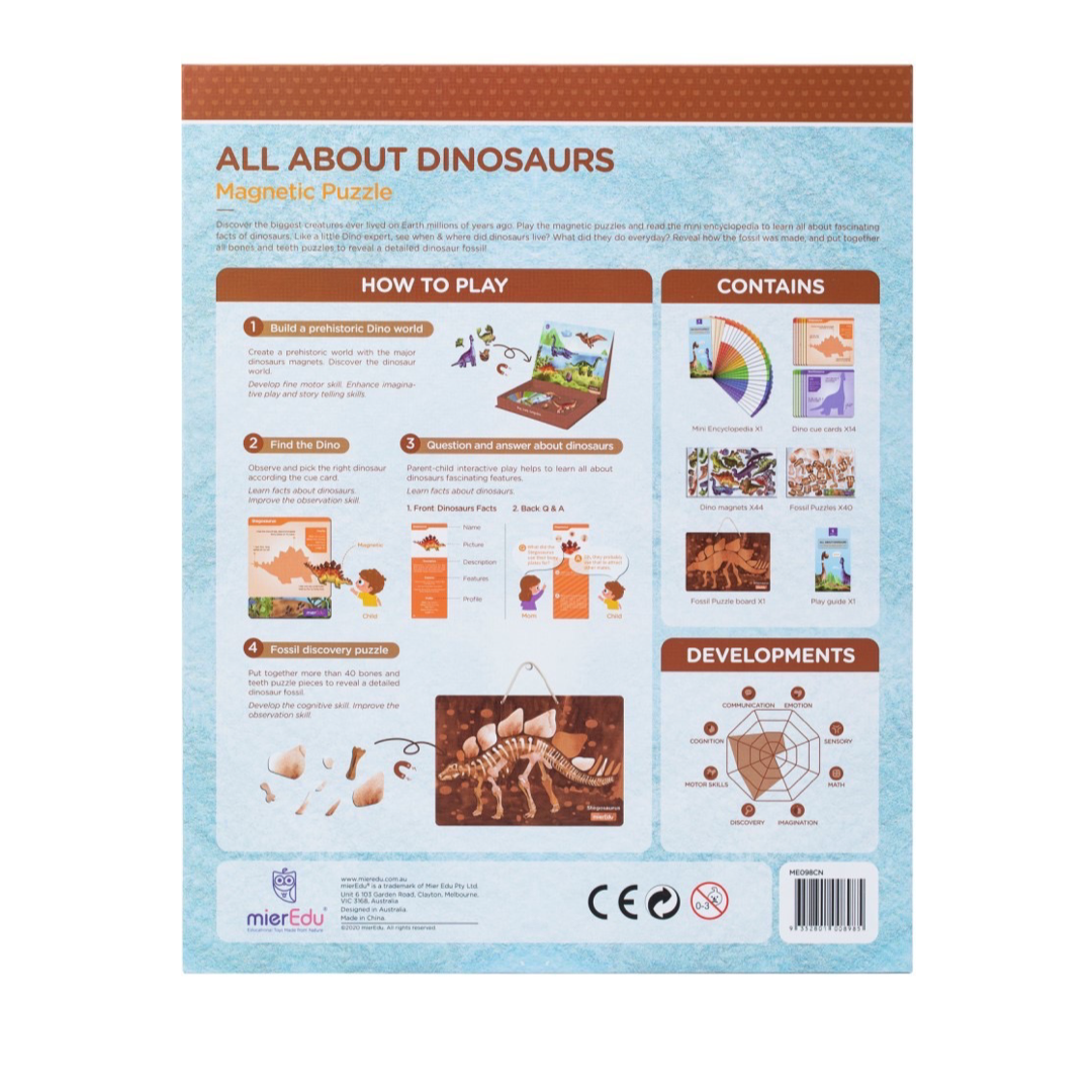 There is so much to learn about the biggest creatures that ever lived on earth millions of years ago. Play with the magnetic puzzles and read the mini-encyclopedia to learn all about the fascinating facts about dinosaurs. Like a little Dino expert, see when and where the dinosaurs lived. What did they do every day? Learn how the fossils were made. Put together the bones and teeth puzzles to reveal a detailed dinosaur fossil.