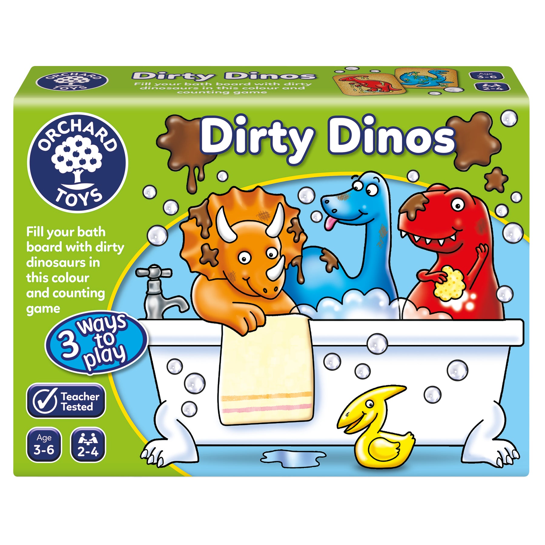 Fill your tub with squeaky clean dinosaurs in this fun colour, counting and observation game with three ways to play! Fun educational game for 2-4 players.