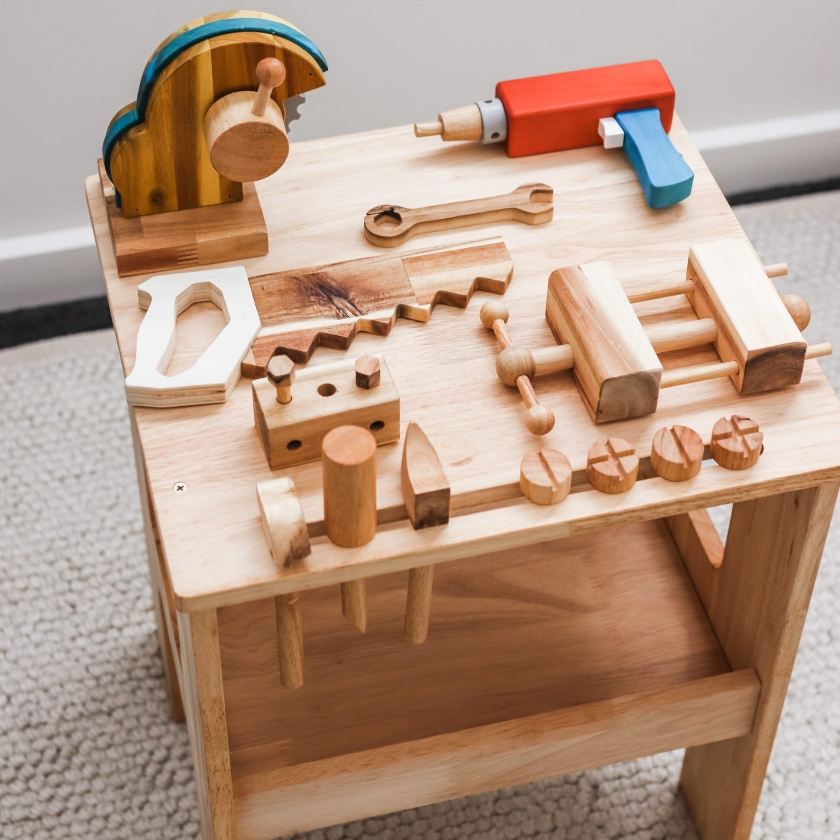 Little carpenters will spend hours enthralled in imaginative play with The Wooden Work Bench from QToys. It boasts a sturdy wooden top, complete with a wooden vice, storage tray, and table saws, providing young builders with everything they need to embark on exciting projects. Its generous size encourages collaboration and cooperation, allowing children to work together, share ideas, and bring their visions to life. This wooden workbench set can be a great addition to a toddler’s toy collection. It provides many opportunities for imaginative play and learning.