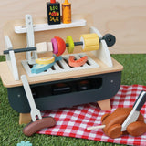 A self-standing wooden barbeque toy with removable grill from Tender Leaf. Includes lots of fun accessories: 3 glowing coals, rotisserie 5-part chicken, 2 sausages and prong, wooden skewer with 5 vegetable pieces to thread on, 2 prawns, fish, lemon slice, BBQ sauce and mustard pots, tongs and pretend knife. Perfect for pretend play and easy to pack away under the grill after play.