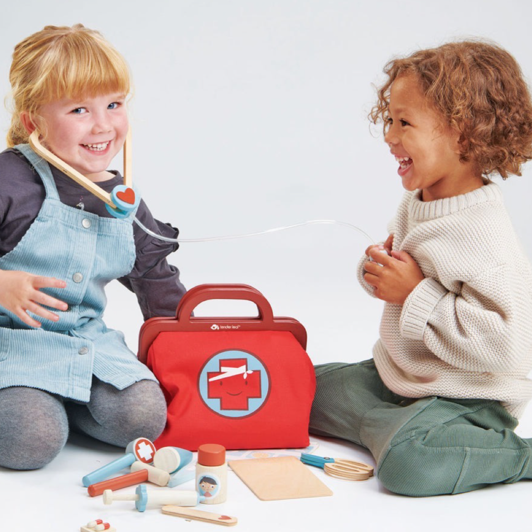 This funky retro-styles canvas and wood doctor’s bag full off all the essentials for treating ill patients from Tender Leaf, makes a beautiful gift. Set includes: stethoscope, scissors, ear probe, syringe, knee hammer, blood pressure monitor, cloth mask, plasters, stickers showing ailments and remedies, clipboard, thermometer, flat stick, bottle of pills and ointment tube. Enjoy endless hours of pretend and role play with this comprehensive kit.