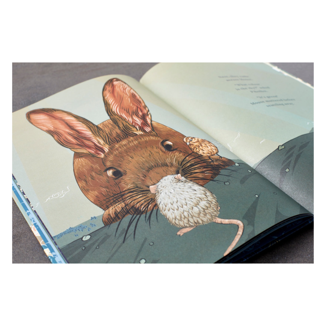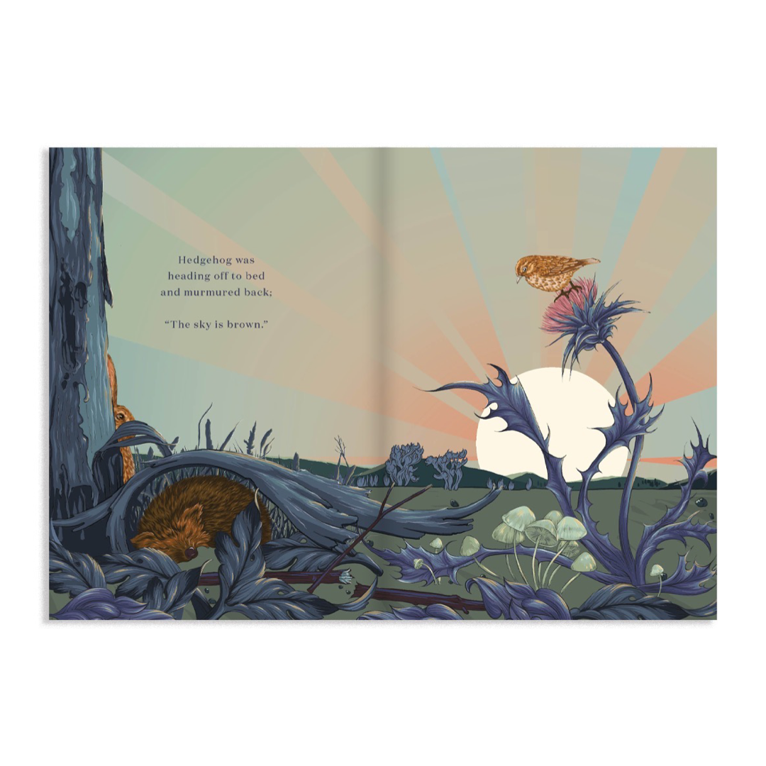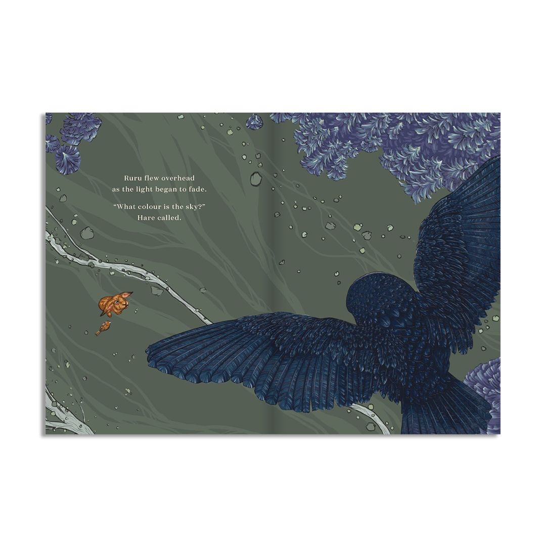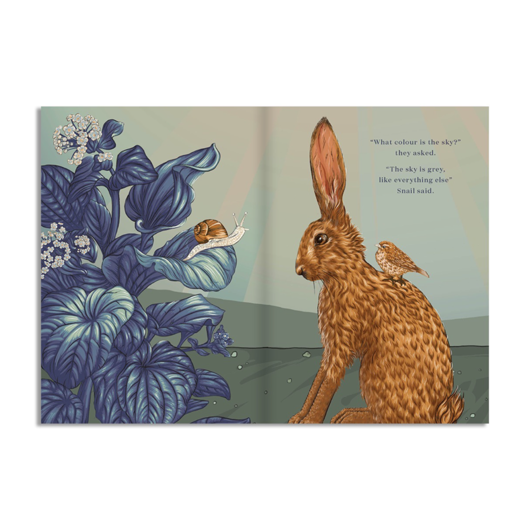 Hare thinks it is blue, but when they talk to Hedgehog, Snail, Mouse, Frog and Ruru, the other creatures each say the sky is a different colour.